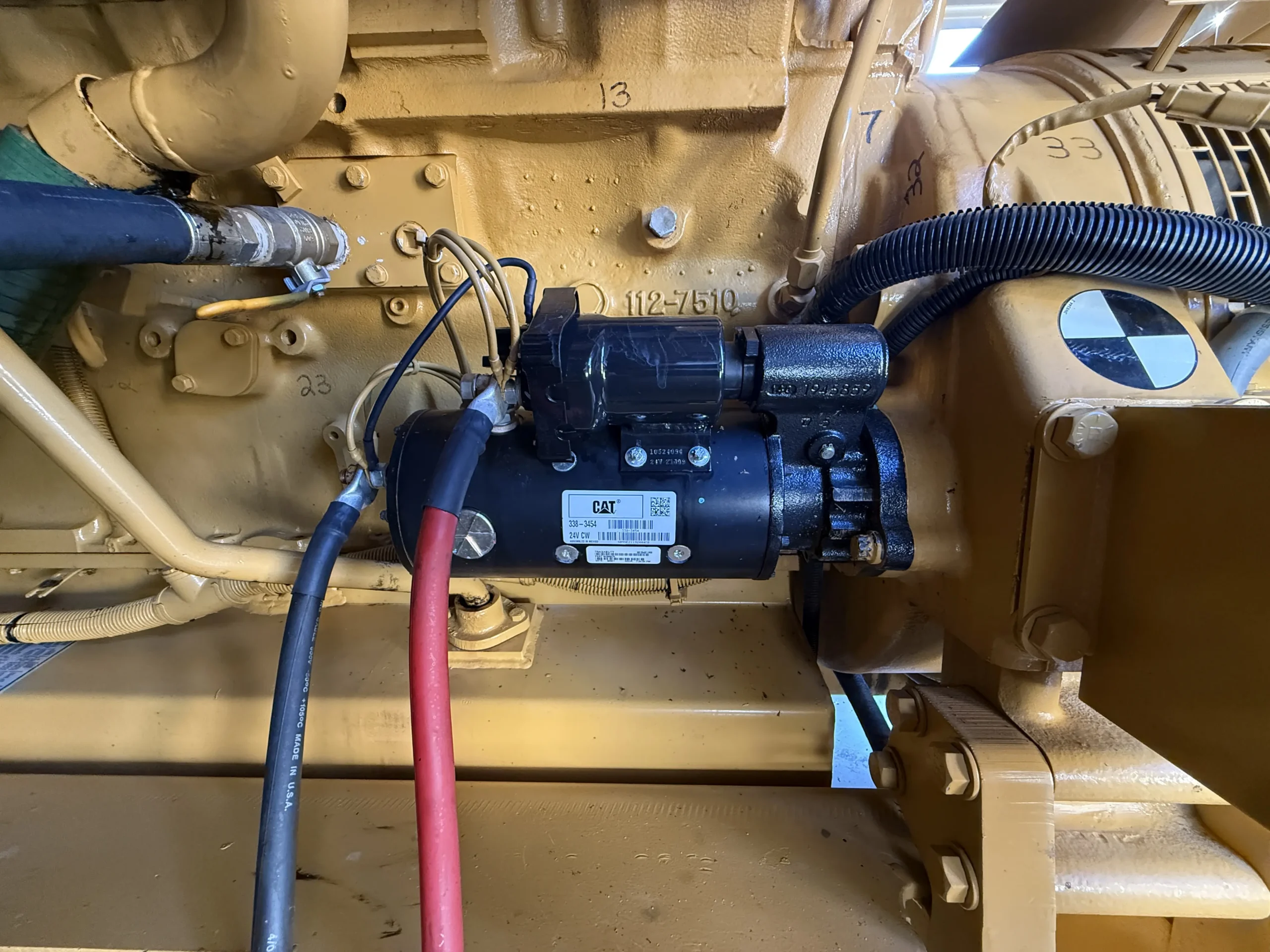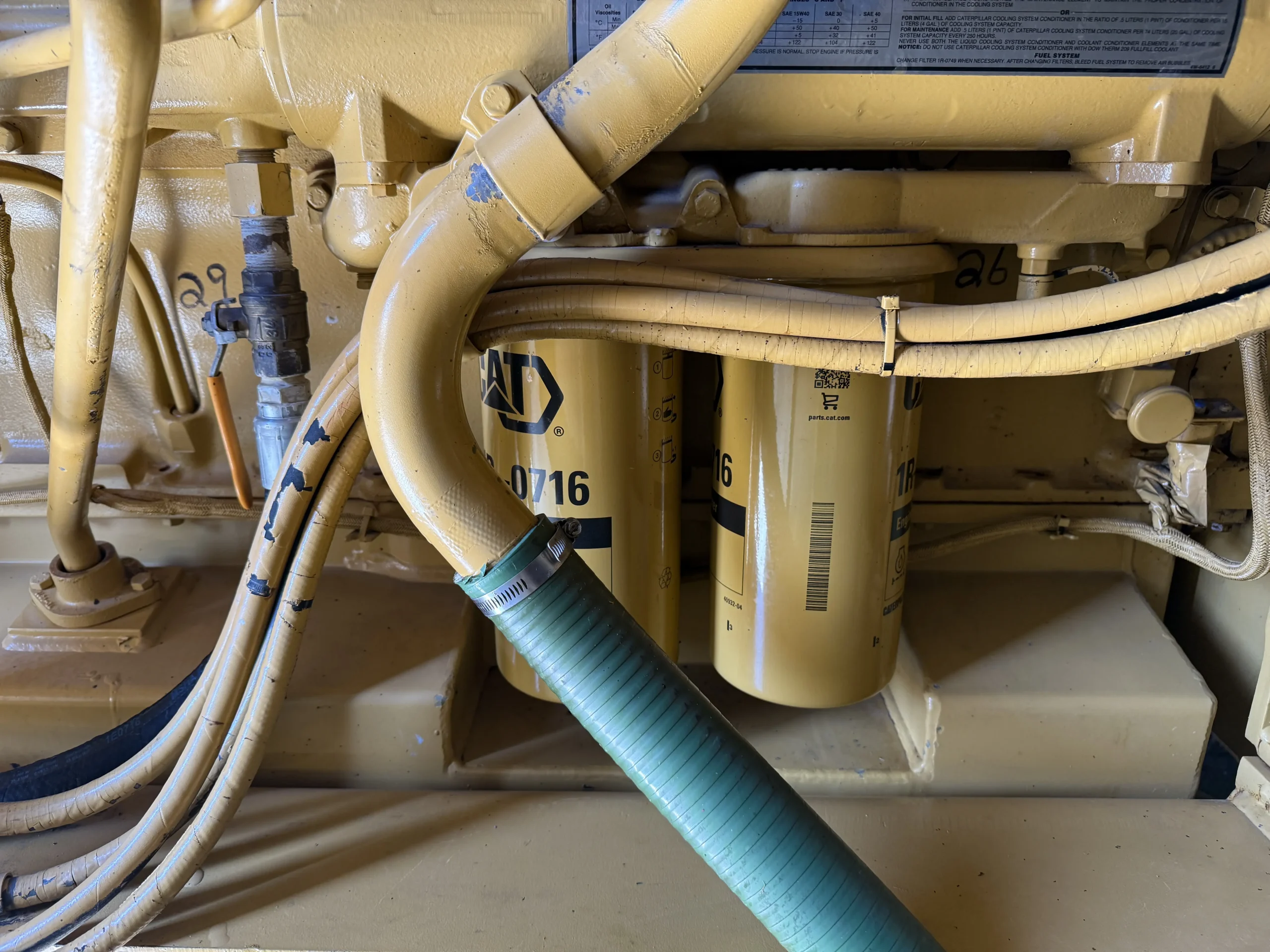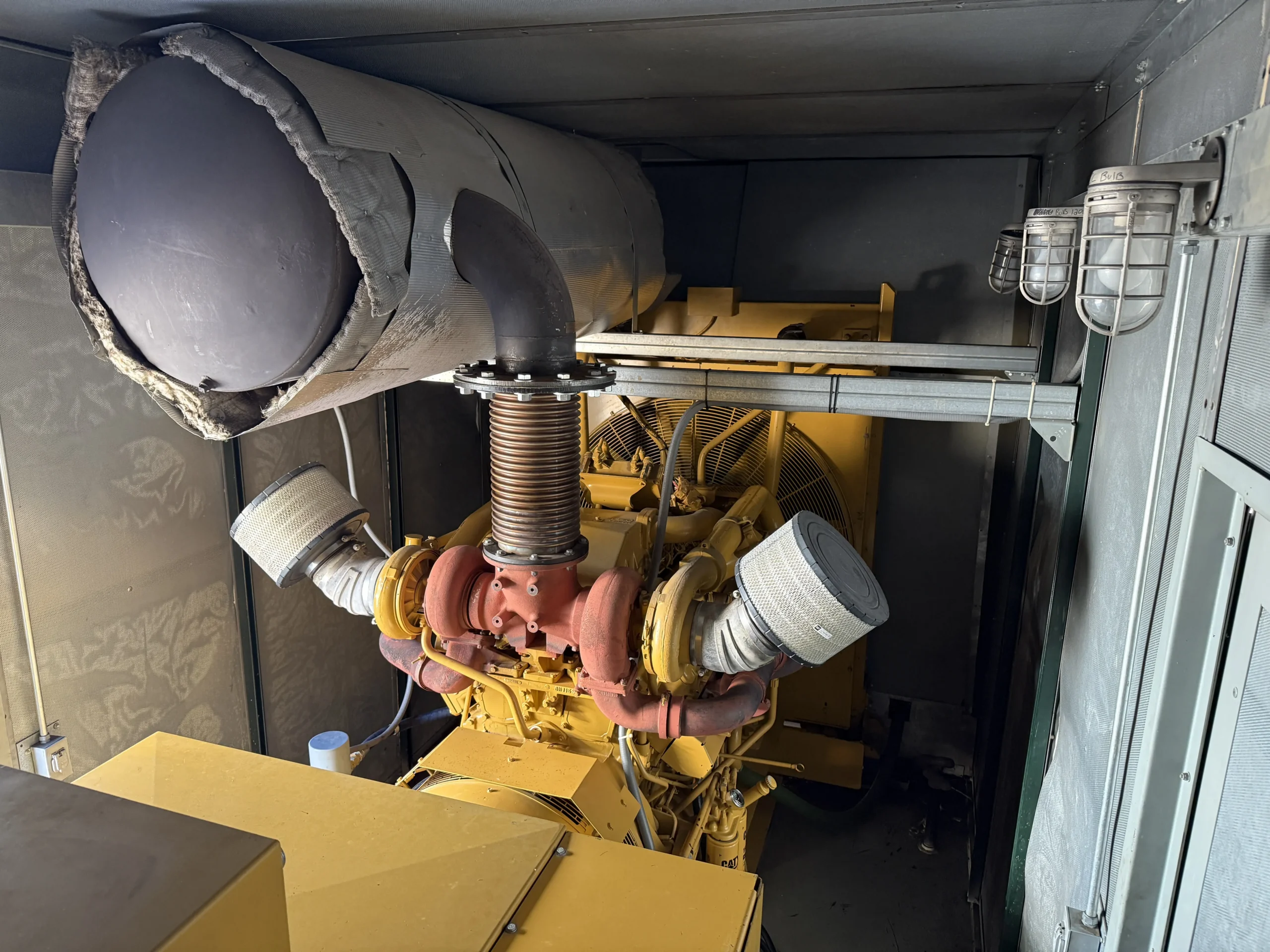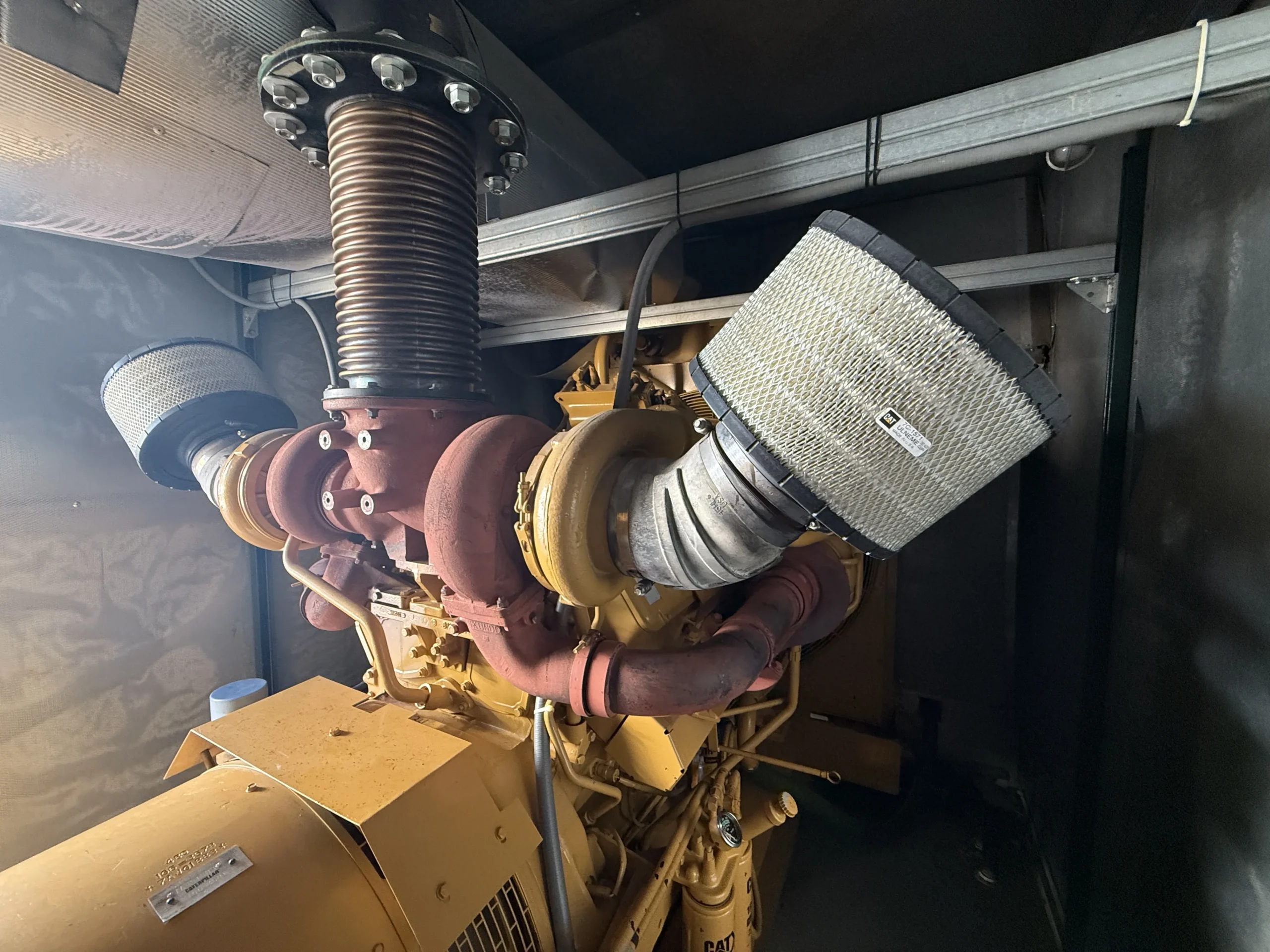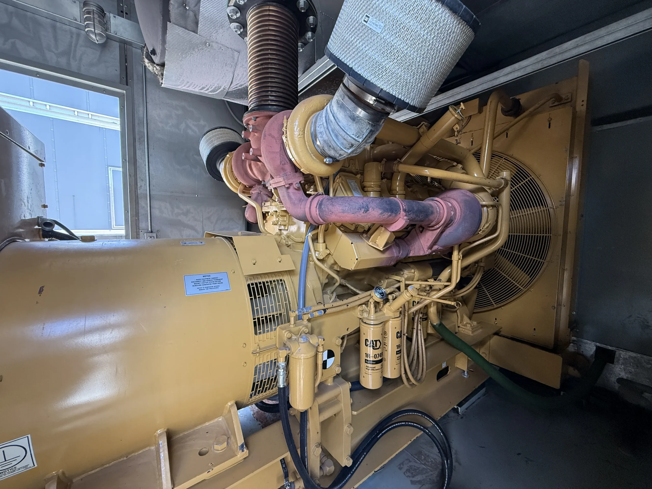 The package includes a heavy-duty radiator and cooling system, dual turbochargers with air intake filtration, ground-fault protection panel, fuel/water separator, dual CAT spin-on fuel filters, jacket water heater, heavy-duty starting batteries, and automatic battery chargers.