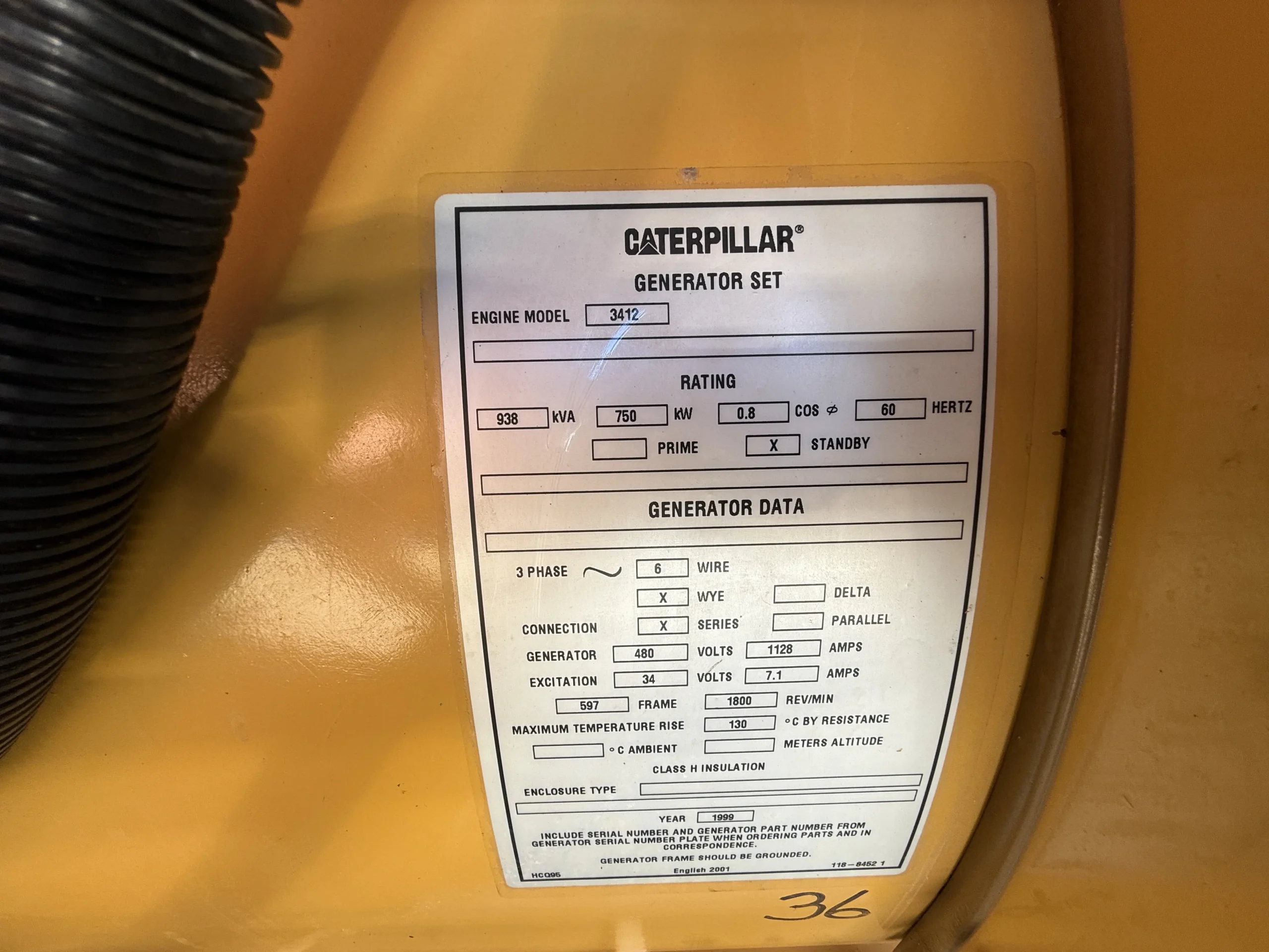 This 1999 Caterpillar 3412 diesel generator set is a heavy-duty industrial standby power system built for commercial, utility, and large-facility backup power applications. The unit is rated 750 kW standby / 938 kVA at 60 Hz, operating at 1,800 RPM, and produces 480V, three-phase power. With 946 original operating hours, this generator represents a strong opportunity to acquire a well-built Caterpillar package with moderate runtime.