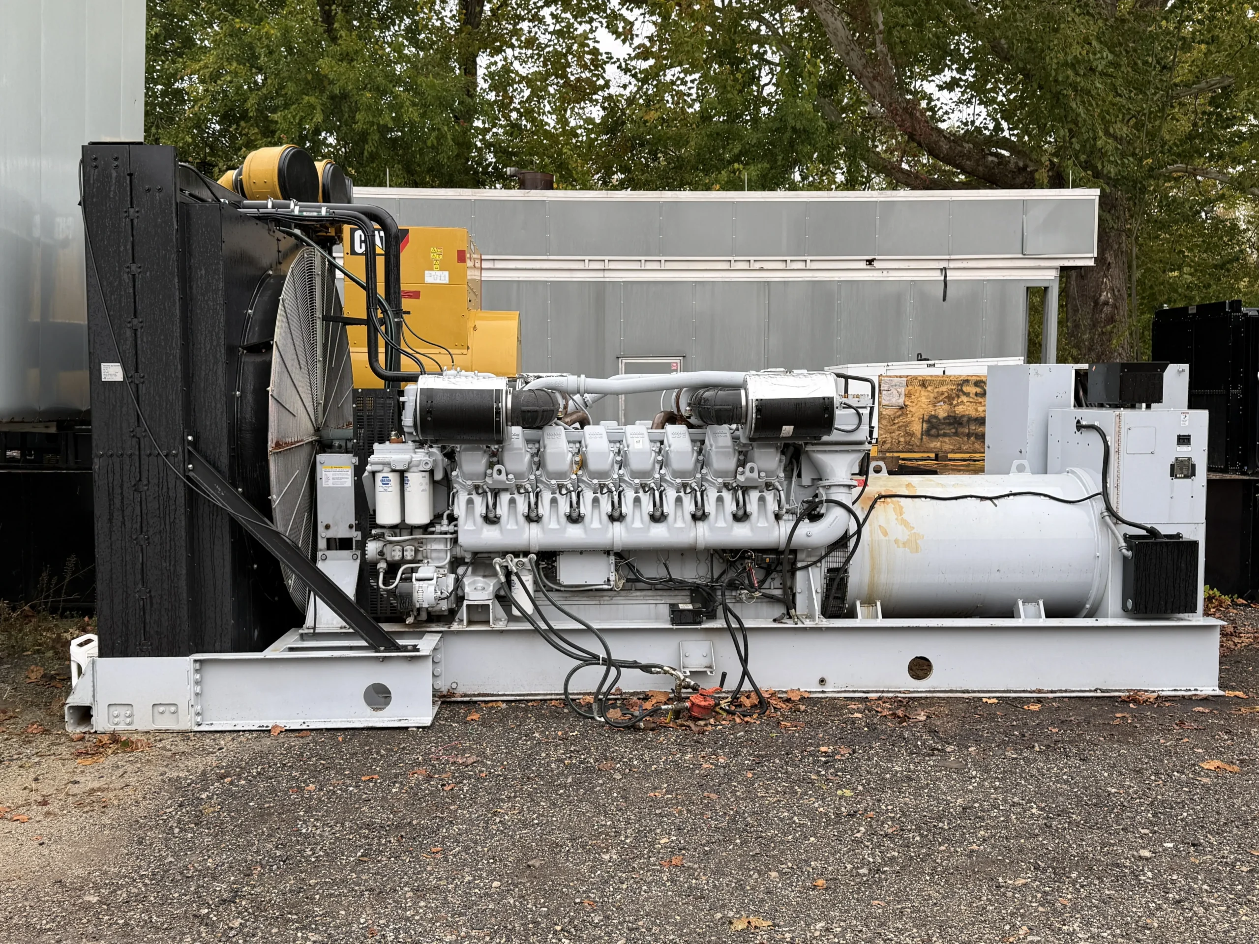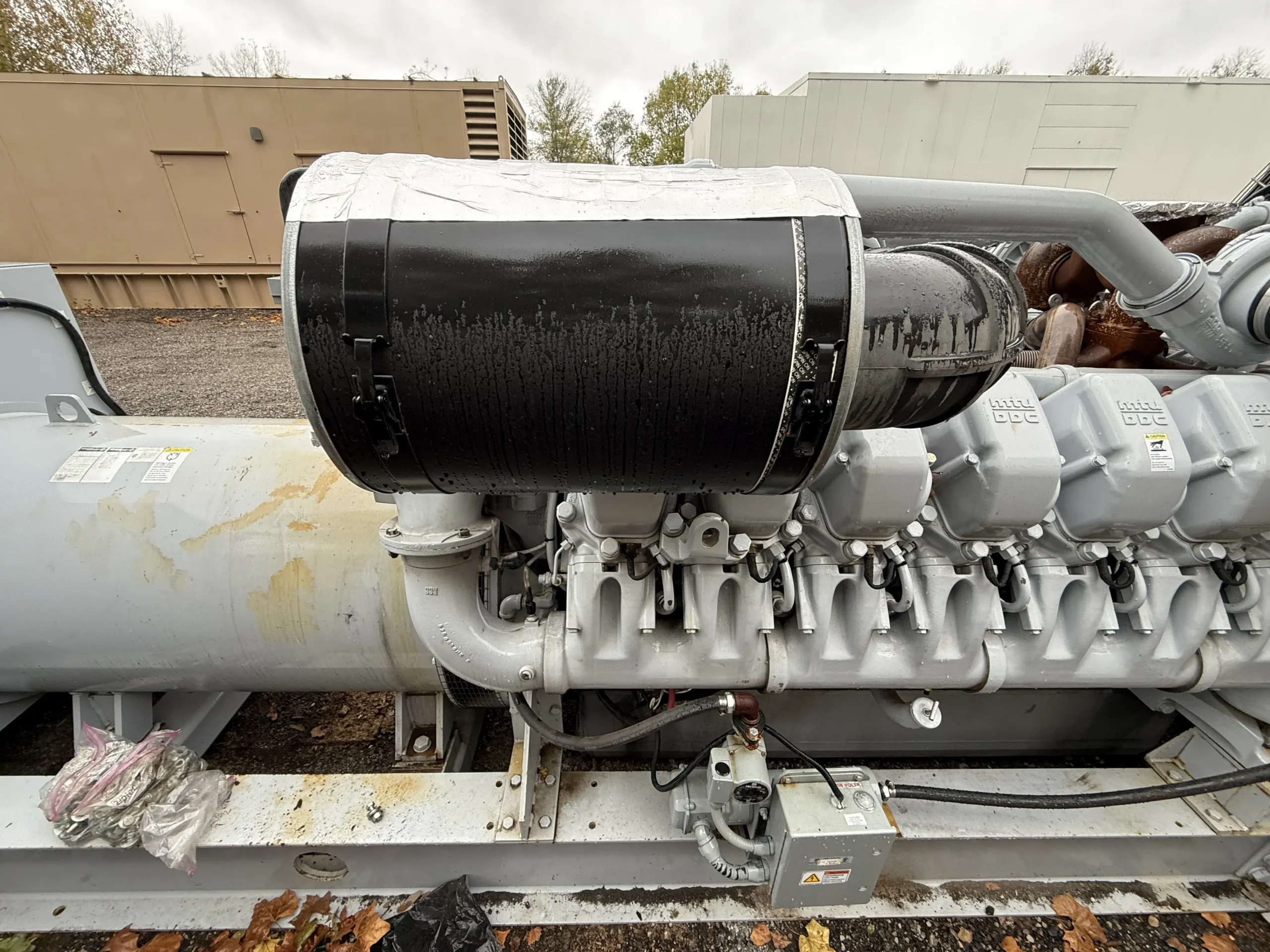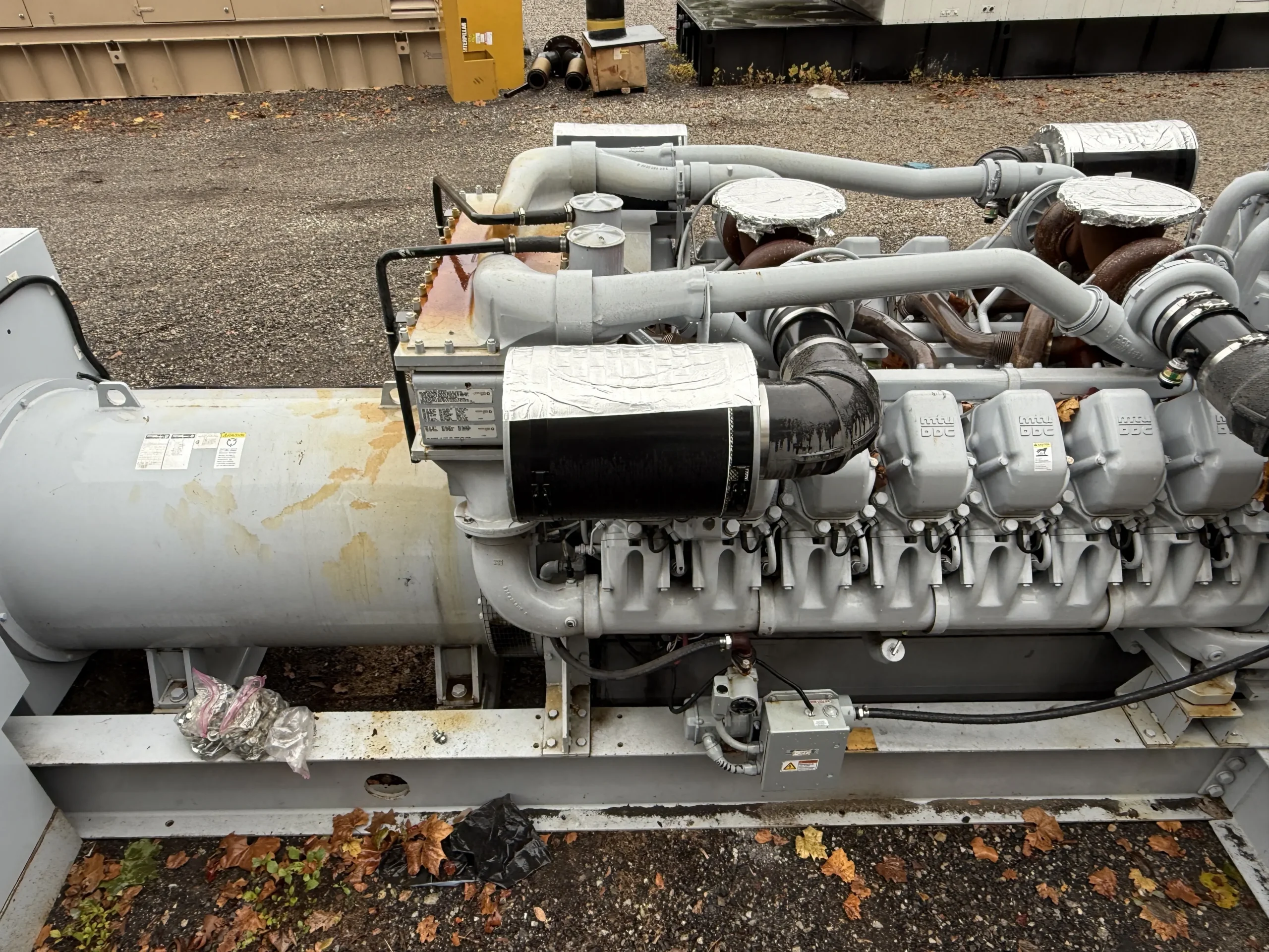 This unit is configured as an open skid package and does not include an enclosure or base fuel tank. It is equipped with an engine-driven radiator, jacket water heater, standard-duty air cleaner, electric start system, 24-volt battery set, charging alternator, and 120-volt battery charger. Built for industrial service, this MTU generator is well-suited for permanent installations, custom enclosure projects, export applications, and large-scale standby or prime power deployments.