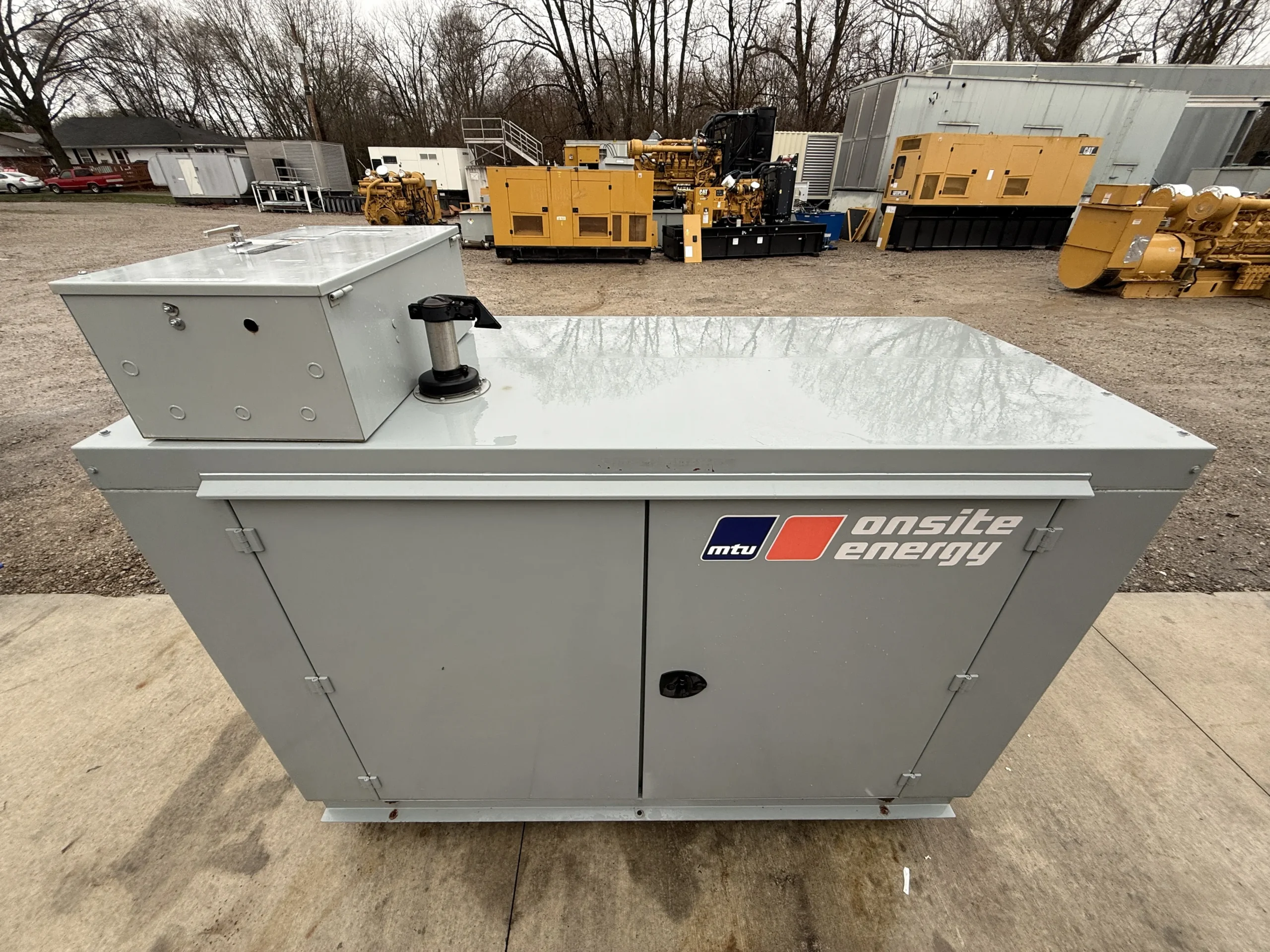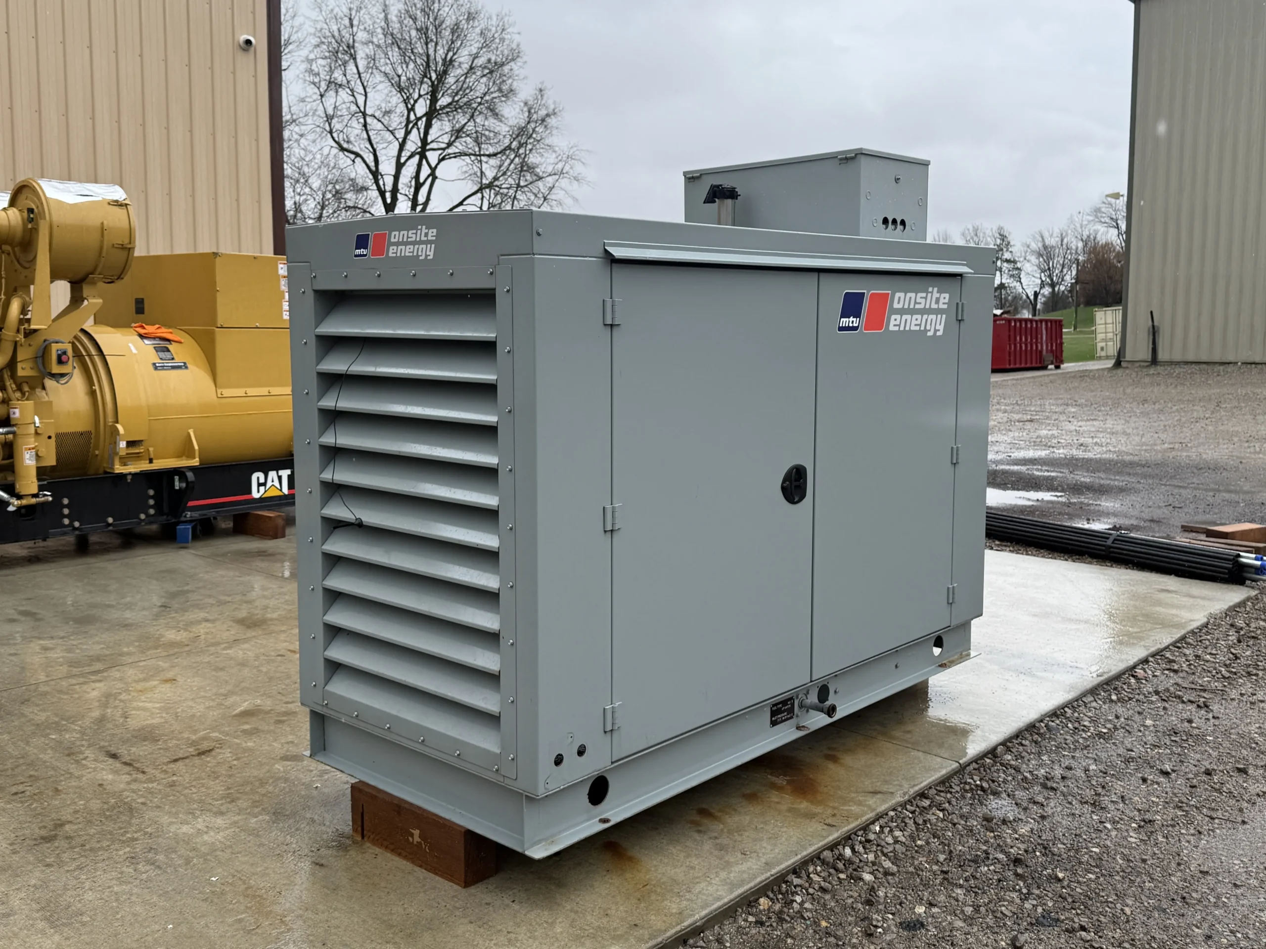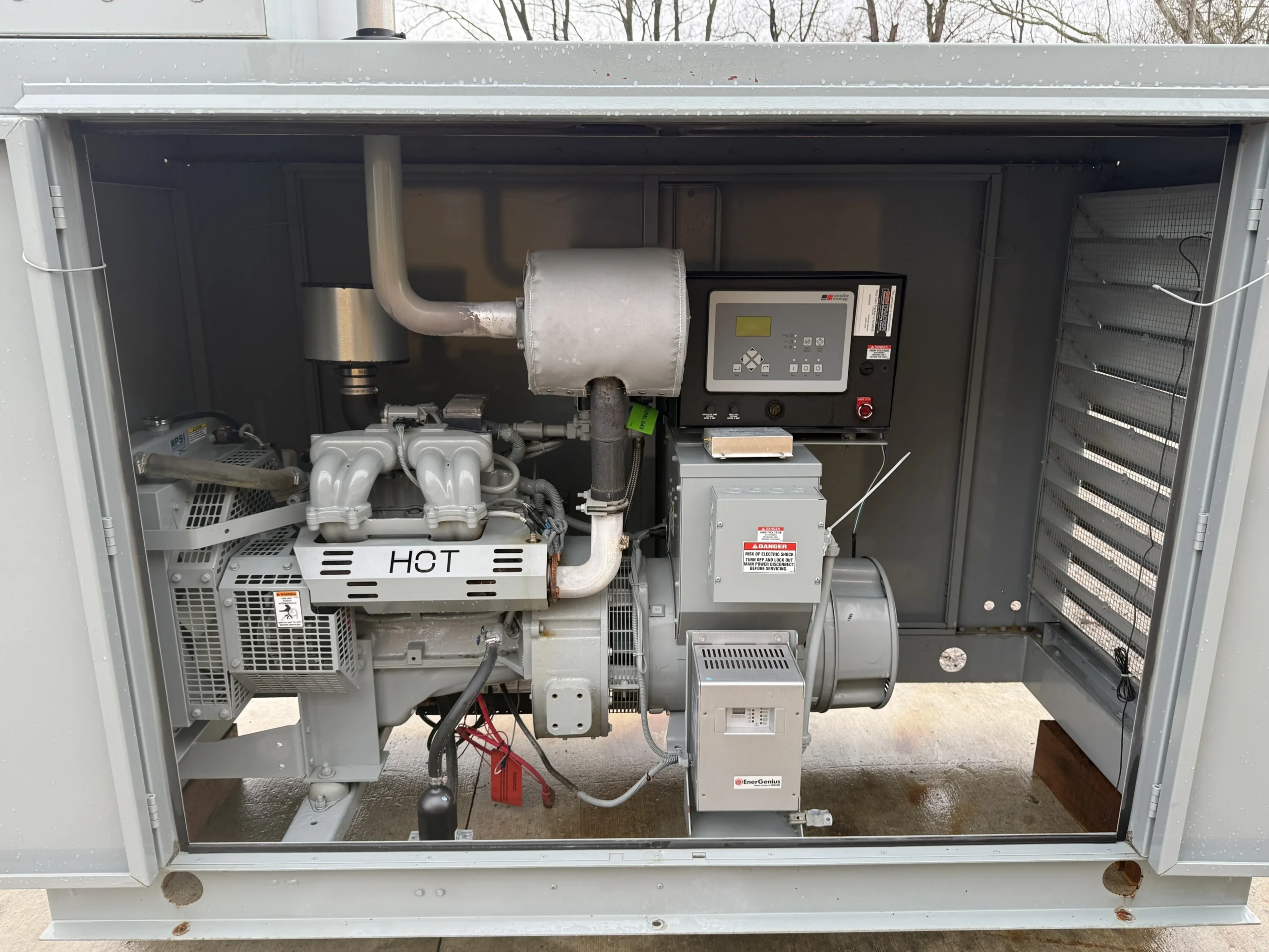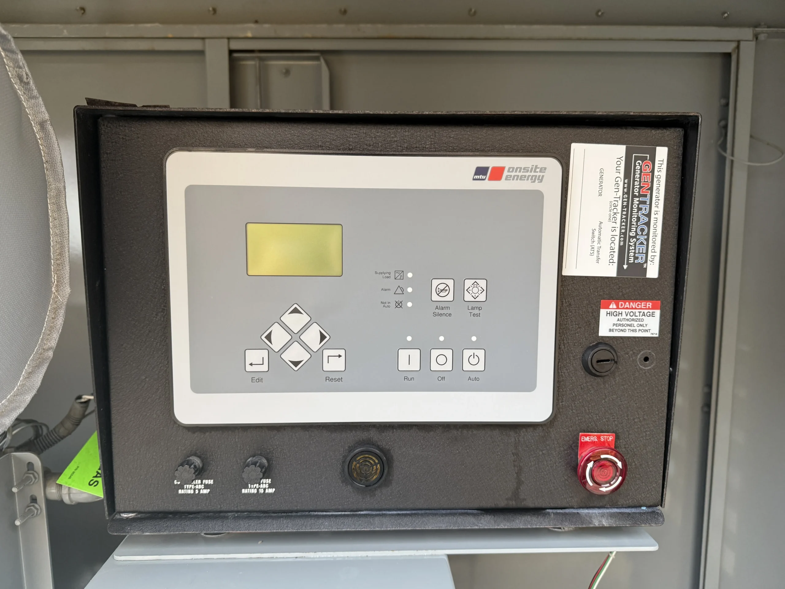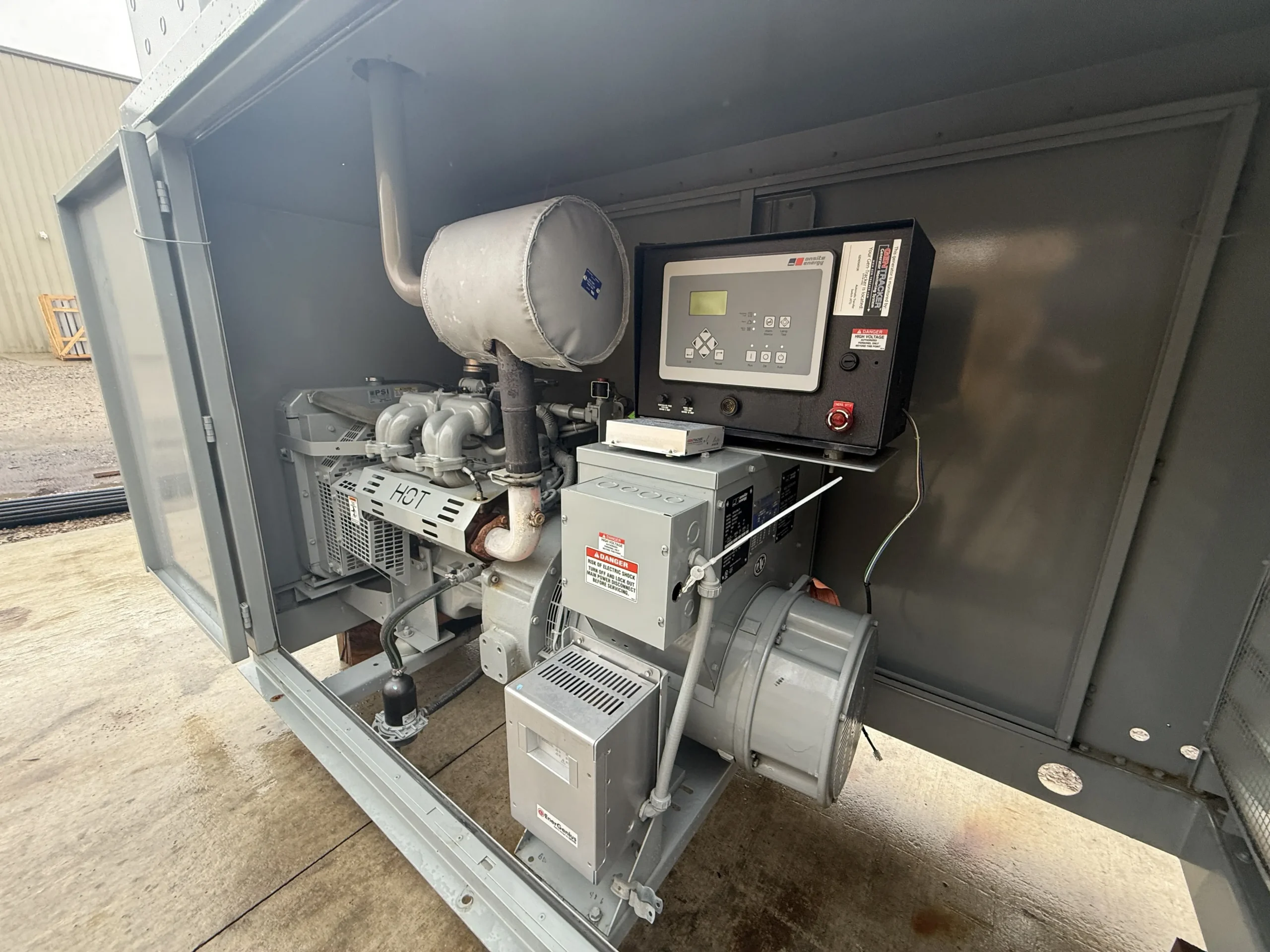 This unit is housed in a weather-protective enclosure (non-sound-attenuated) and is equipped with an MTU digital control panel, integrated mainline circuit breaker, emergency stop, and an EnerGenius battery charger. A GenTracker remote monitoring module is installed for off-site system visibility and alarms.