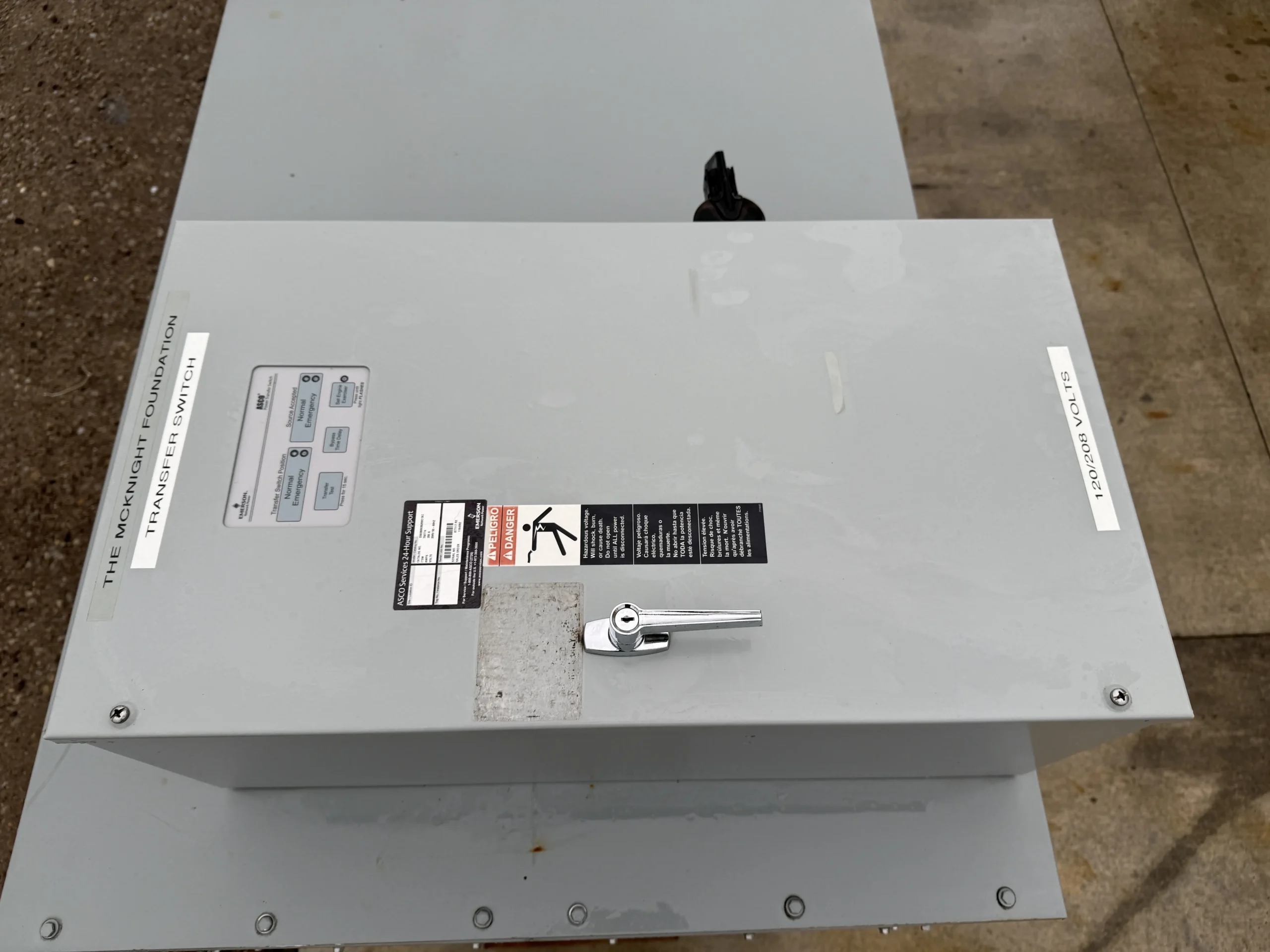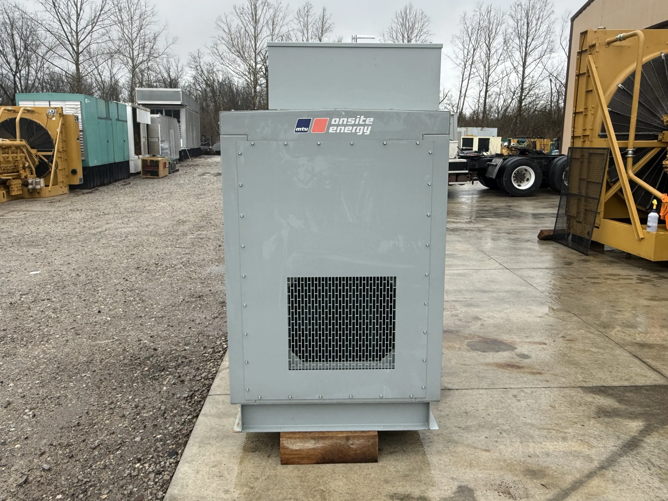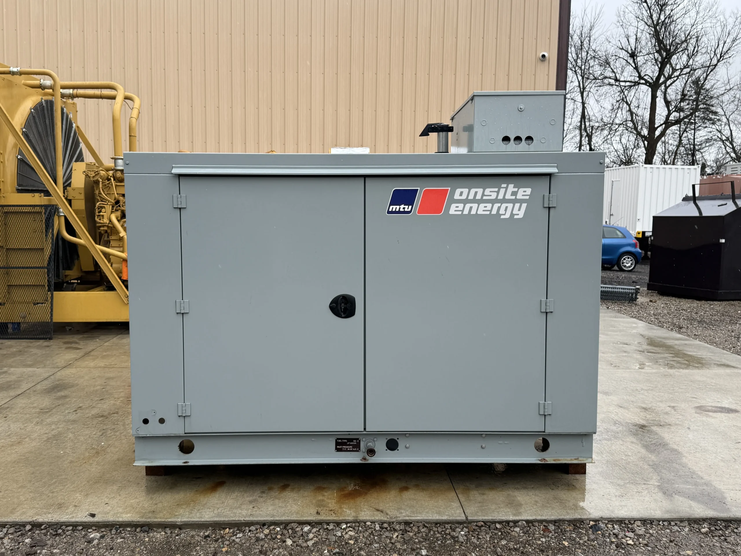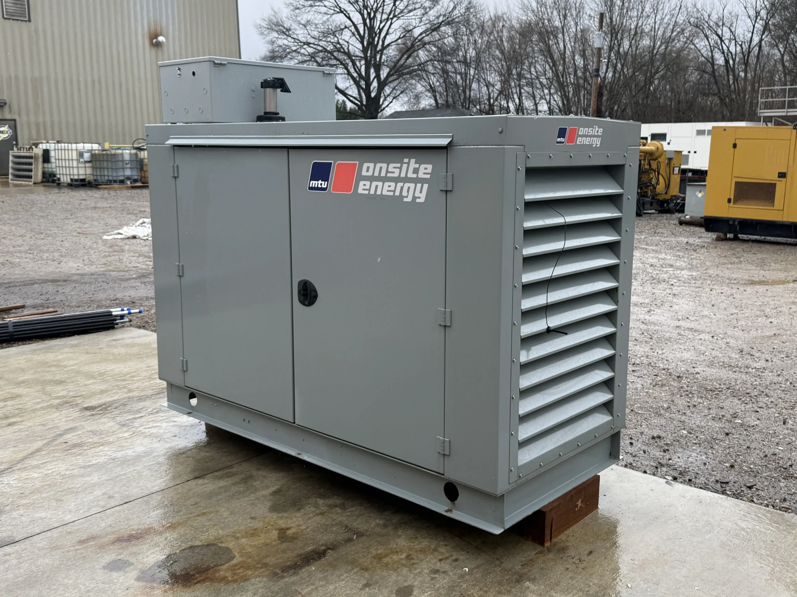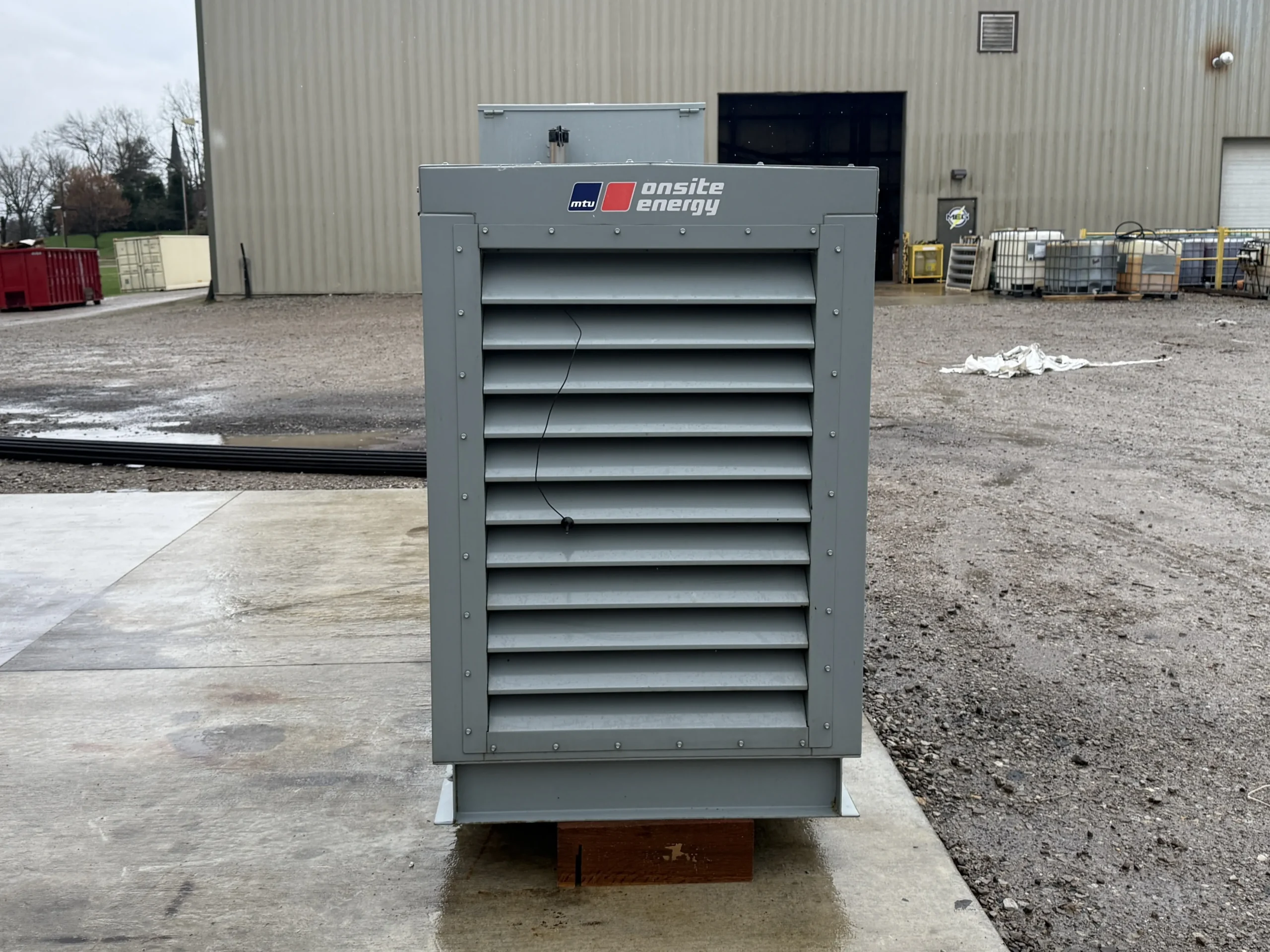 This unit is housed in a weather-protective enclosure (non-sound-attenuated) and is equipped with an MTU digital control panel, integrated mainline circuit breaker, emergency stop, and an EnerGenius battery charger. A GenTracker remote monitoring module is installed for off-site system visibility and alarms.