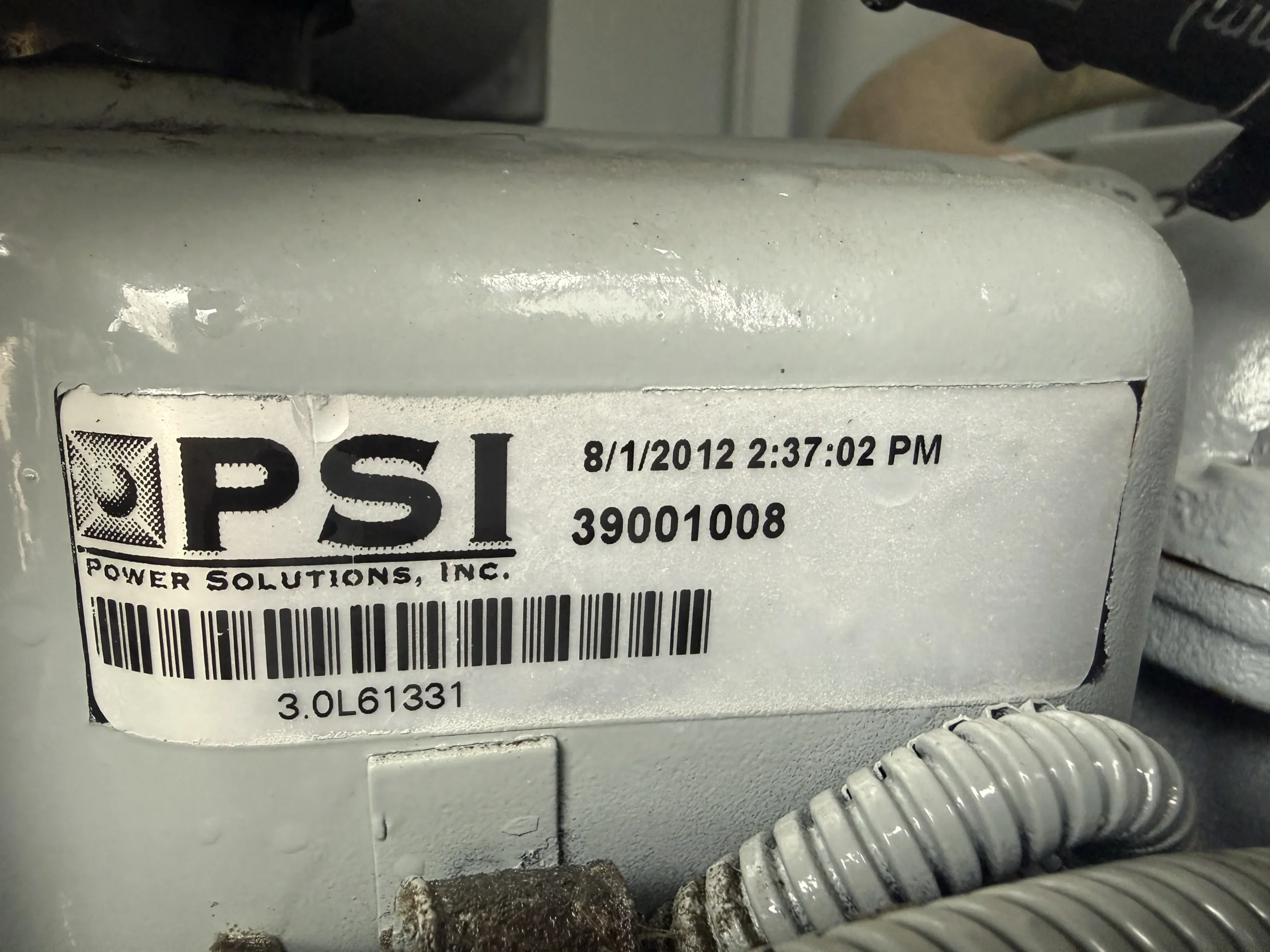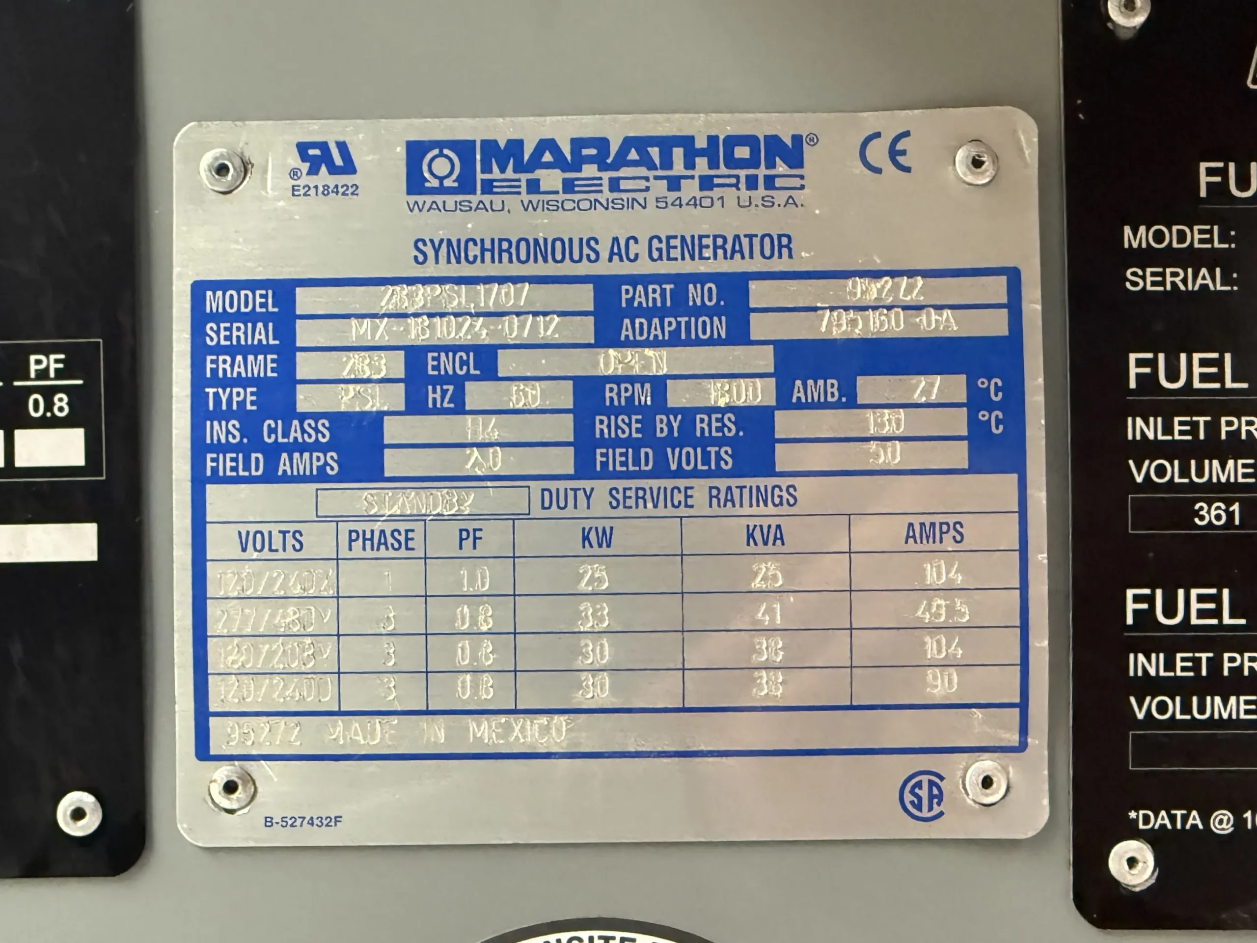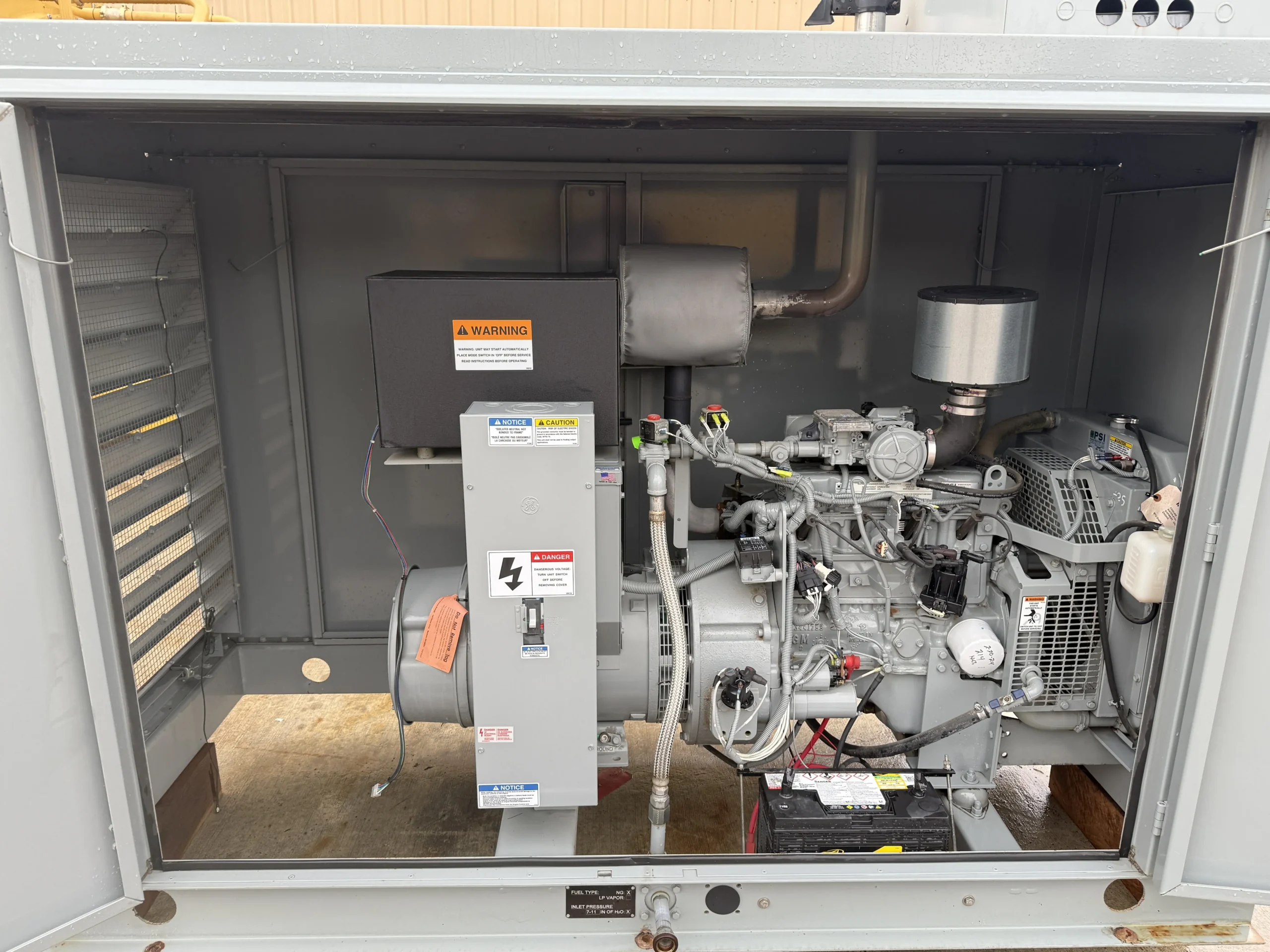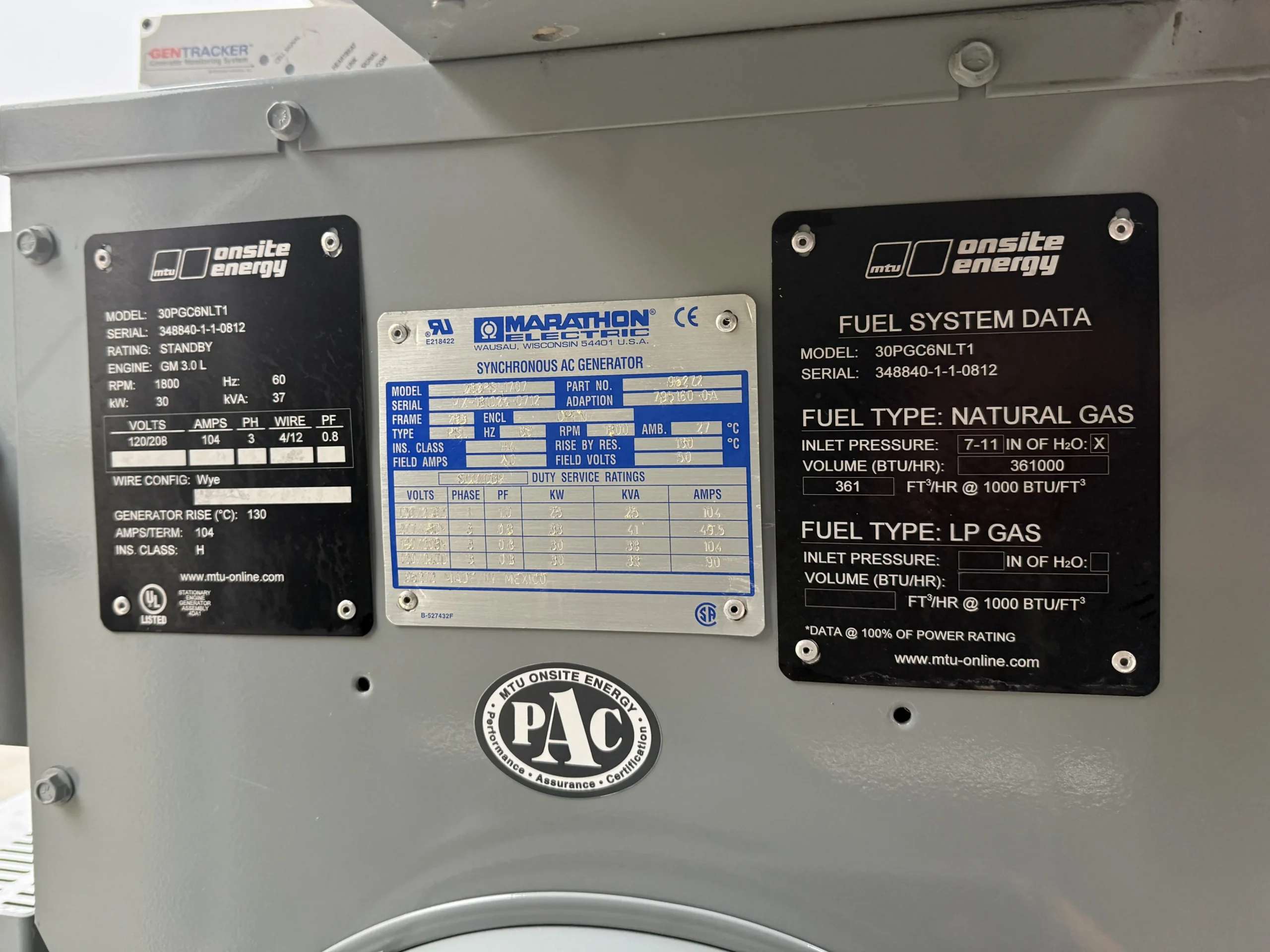 The generator is rated 30 kW / 37 kVA standby and produces 120/208V, three-phase power at 60 Hz and 1800 RPM. It is powered by a GM 3.0L industrial natural gas engine coupled to a Marathon Electric synchronous alternator with Class H insulation.