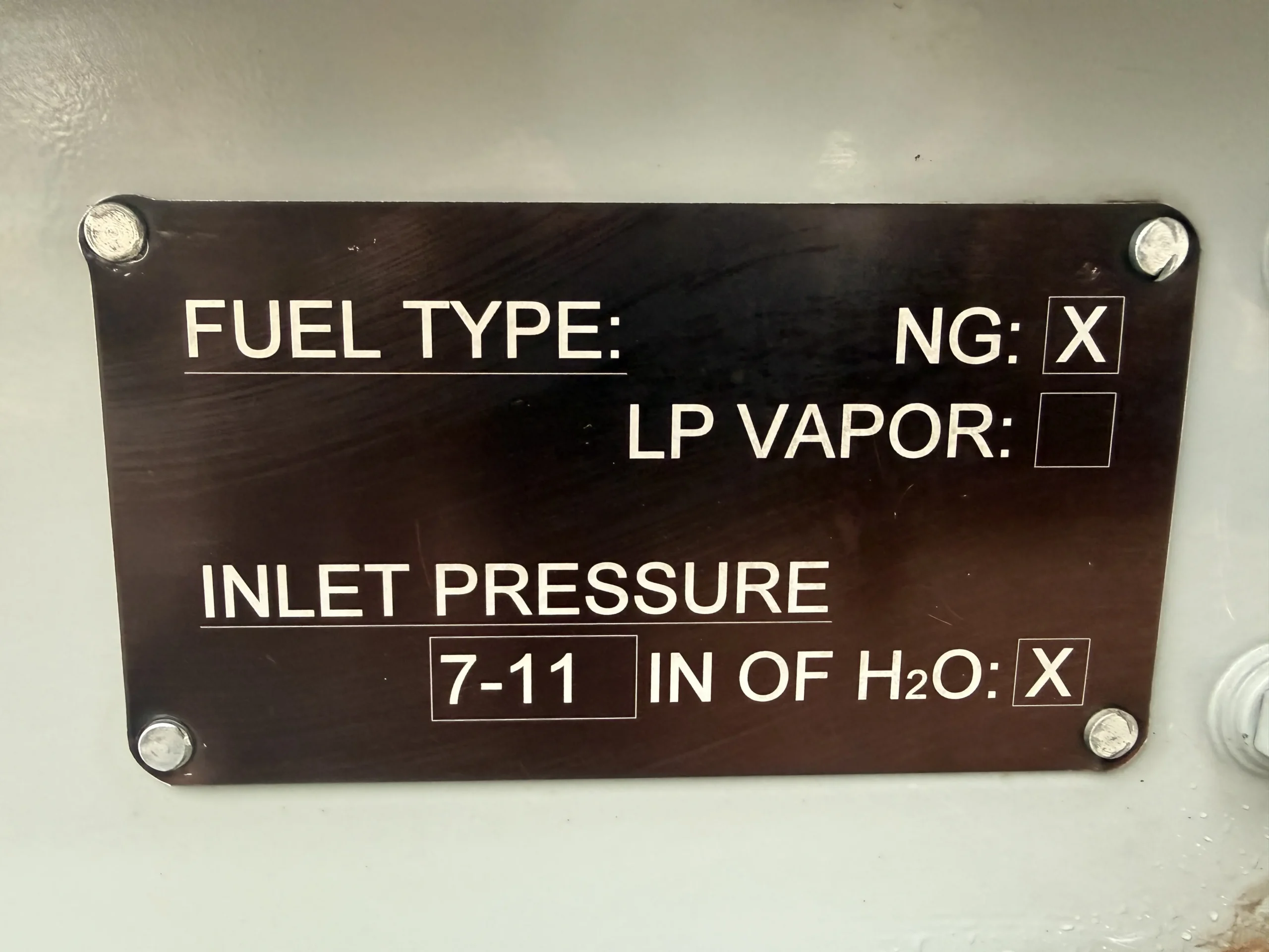 Fuel system data indicates natural gas operation with a required inlet pressure of 7–11 inches of water column and full-load consumption of approximately 361,000 BTU/hr. This generator does not have a jacket water heater installed.