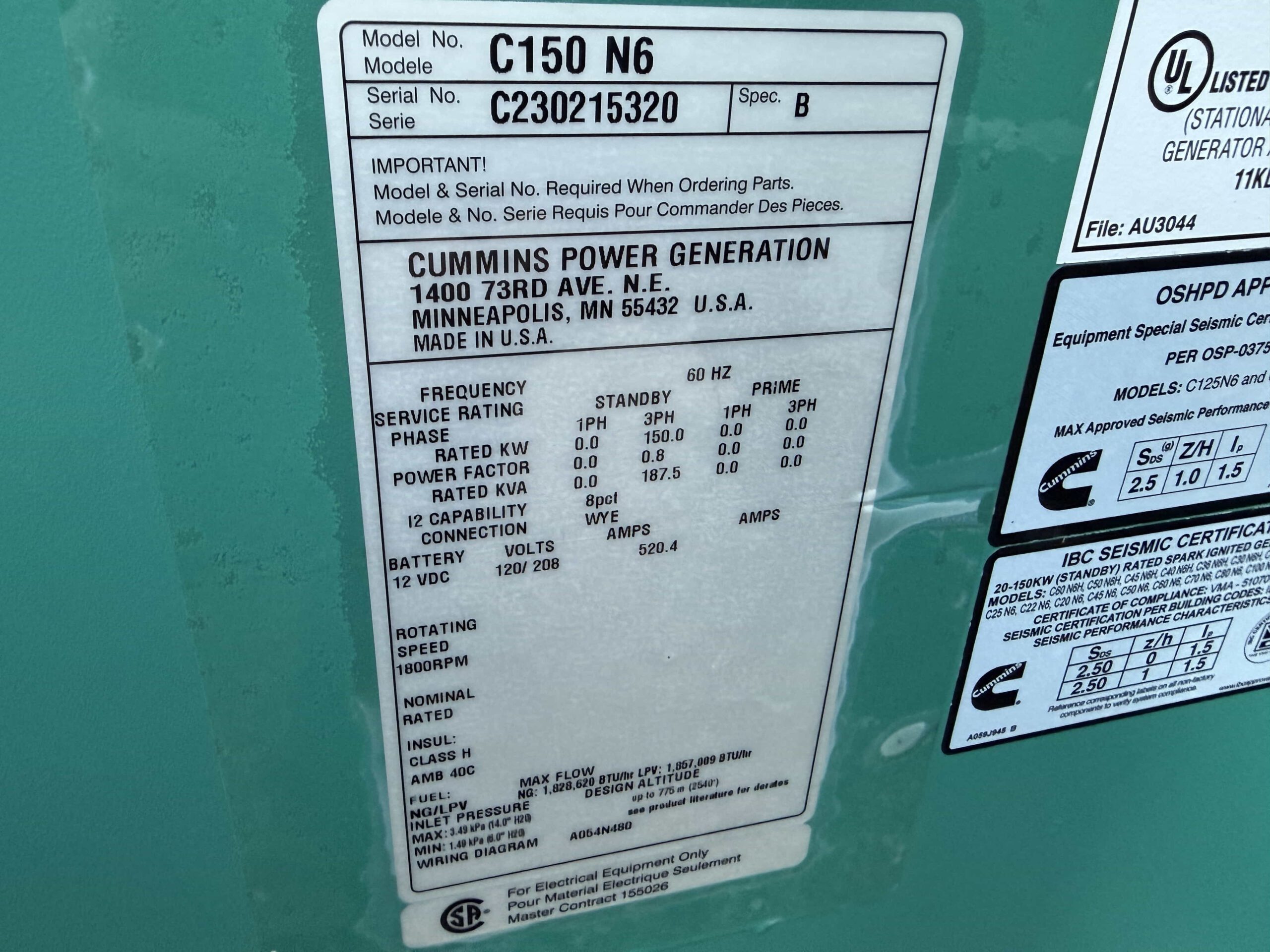 | Generator Model | C150 N6 |
